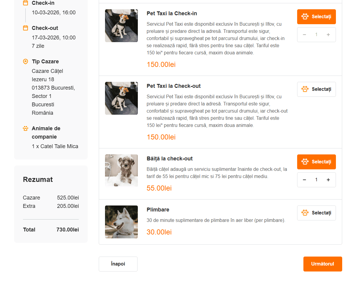 În funcție de talia animalului tău, alegi pachetul potrivit și apeși „Selectați”. Poți bifa opțional check‑in devreme sau check‑out târziu. Când ești gata, apeși „Următorul”.