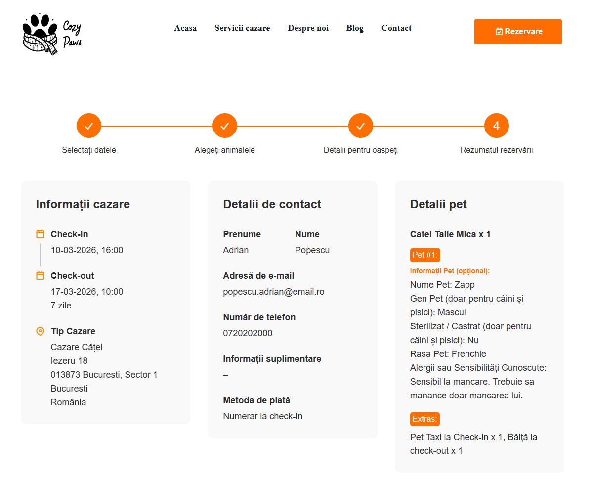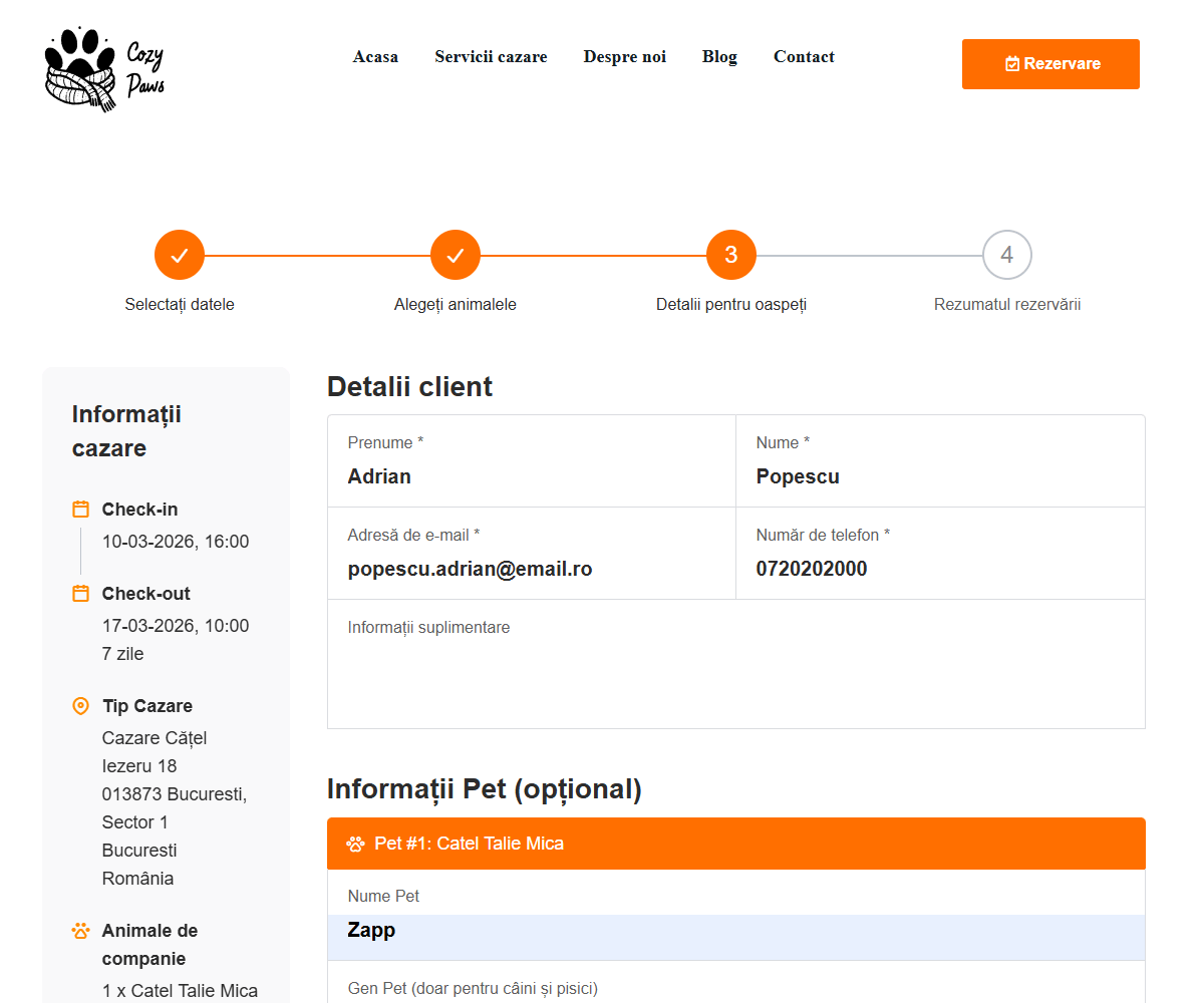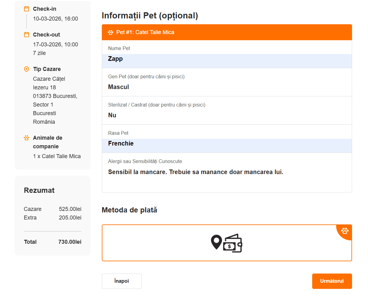 Introduci numele, prenumele, e‑mailul și telefonul. Apoi completezi detaliile despre animal: nume, rasă, sterilizare, vaccinări. În Observații poți menționa alergii, tabieturi sau nevoi speciale. Selectezi metoda de plată și continui.