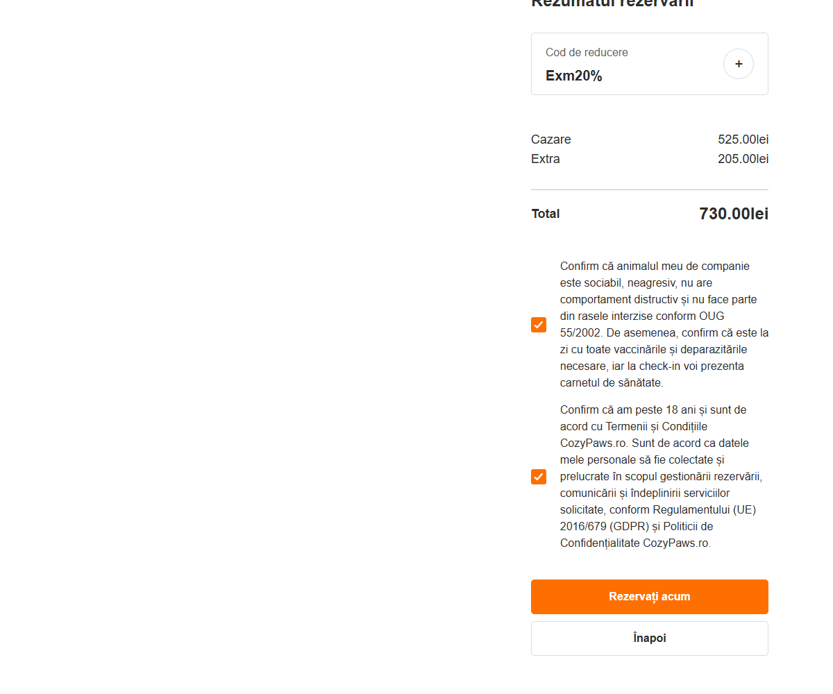 Dacă ai un cod de reducere, îl introduci aici. Bifezi confirmările obligatorii privind sociabilitatea și vaccinările, precum și acordul pentru Termeni și Condiții și GDPR. Finalizezi prin „Rezervați acum” și primești un e‑mail de confirmare.